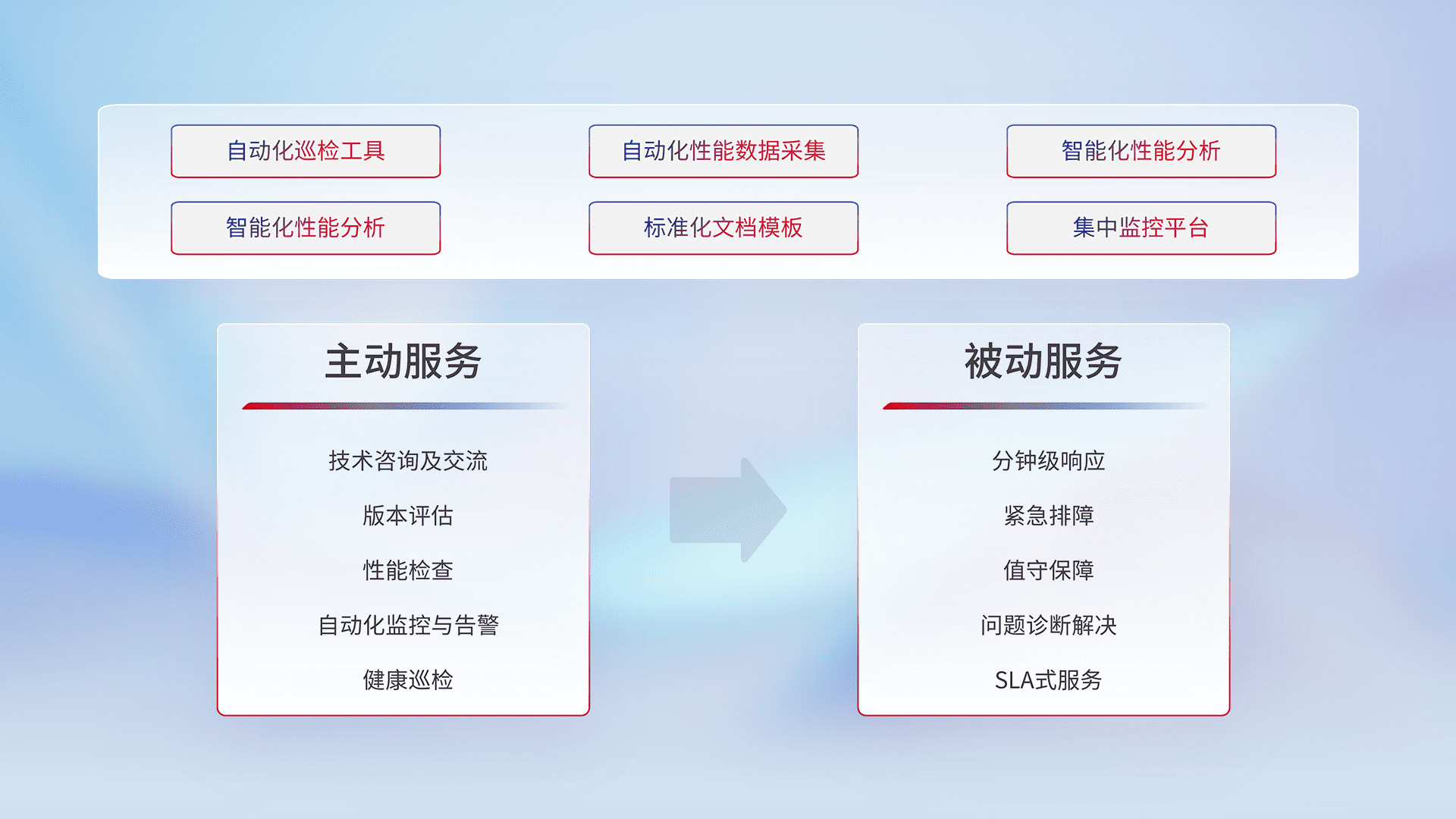 智能化工具和标准化文档,,,保障服务质量,,,,提供主动服务(包含技术咨询、、、版本评估、、性能检查、、、自动化监控与告警、、、、健康巡检)和被动服务包含(分钟级响应、、、紧急排障、、、、值守保障、、、、问题诊断解决、、、SLA服务)。。。